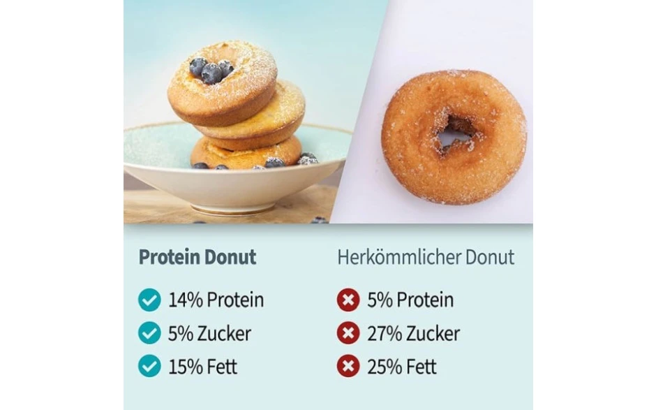 Unsere köstlichen Protein Donuts vertreiben das schlechte Gewissen, denn im Vergleich zum herkömmlichen Donut aus dem dem Süßwarenregal sind die Body Attack Protein Donuts nicht nur das süßeste Geschmackserlebnis bei Sportnahrung-Engel, sondern auch Nährwerte werden um ein Vielfaches übertroffen. Überzeuge Dich selbst: