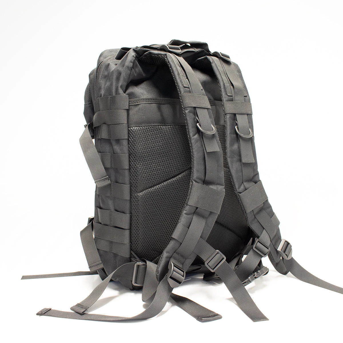 Die Träger sind in der Länge verstellbar und verfügen über Lastkontrollriemen, die das Gewicht zur rückenschonenden Gewichtsverteilung näher zur Mitte bringen. Zwei Schnallen auf jeder Seite helfen außerdem, die Tasche weiter zu komprimieren. Alle Taschen werden mit Reißverschlüssen geschlossen. Das mittelgroße Fach hat mehrere flache Schlaufen, an denen Gegenstände mit Karabinern oder anderen Befestigungssystemen angebracht werden können. Dieser Trainings-Rucksack ist komplett schwarz und aus strapazierfähigem Oxford-Gewebe hergestellt.
